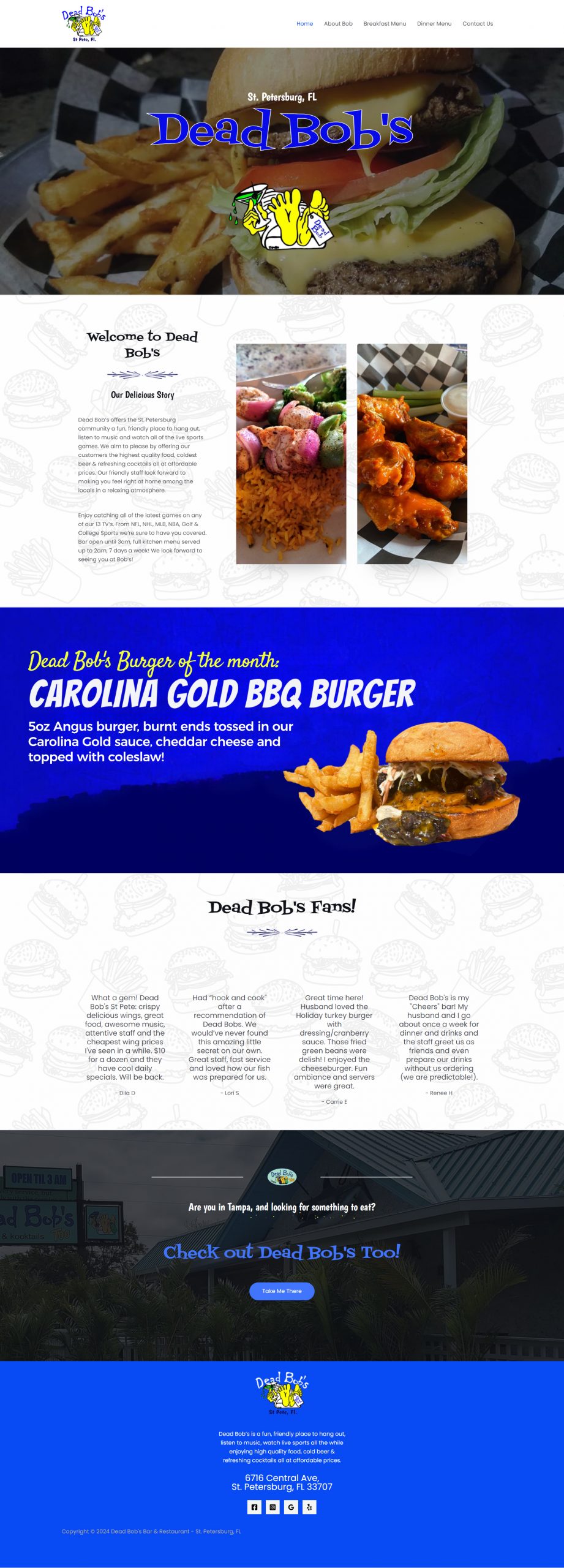 I was very fortunate to work on the business website for a local chain of restaurants in the Tampa/St. Petersburg area called Dead Bob’s. I enjoyed working with their pre-established brand to translate their aesthetic into a functional website.